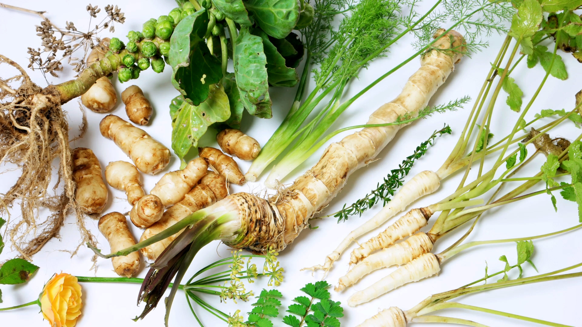 Brussels sprouts, horseradish, parsnip, fennel, Jerusalem artichoke, fennel flowers, salad burnet, fennel seeds, rose, thyme (2015)