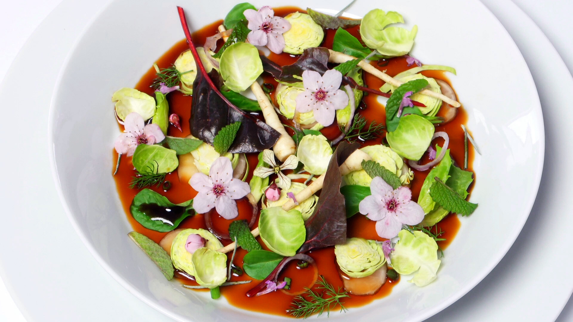Plum blossom, chard, red onion, Jerusalem artichoke, mint, curry plant, corn slad, endive, baby parnsnip, fennel, rucola flower, Brussels sprouts, soy sauce (2016)